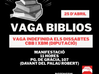 PER UN BON SERVEI BIBLIOTECARI PÚBLIC, SALARIS I CONDICIONS DE TREBALL DIGNES! LES BIBLIOTEQUES ANEM A LA VAGA. ENS PLANTEM ELS DISSABTES, DE FORMA INDEFINIDA Comunicat conjunt per a les treballadores del Consorci de Biblioteques de Barcelona i per a les treballadores de la Gerència del Servei de Biblioteques de la Diputació de Barcelona. Les […]