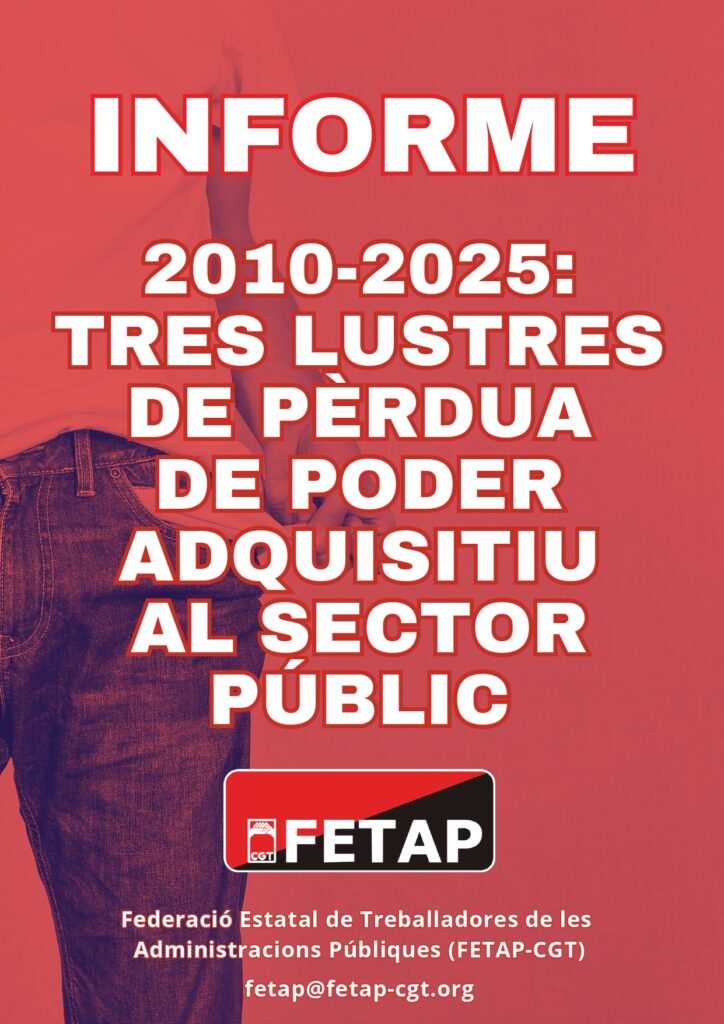 La Federació Estatal de Treballadores de les Administracions Públiques (FETAP-CGT) fem públic l’informe “2010-2025: Tres lustres de pèrdua de poder adquisitiu al sector públic”, que constata una pèrdua acumulada del 18,15% en els salaris públics enfront de l’increment de l’IPC en el mateix període.