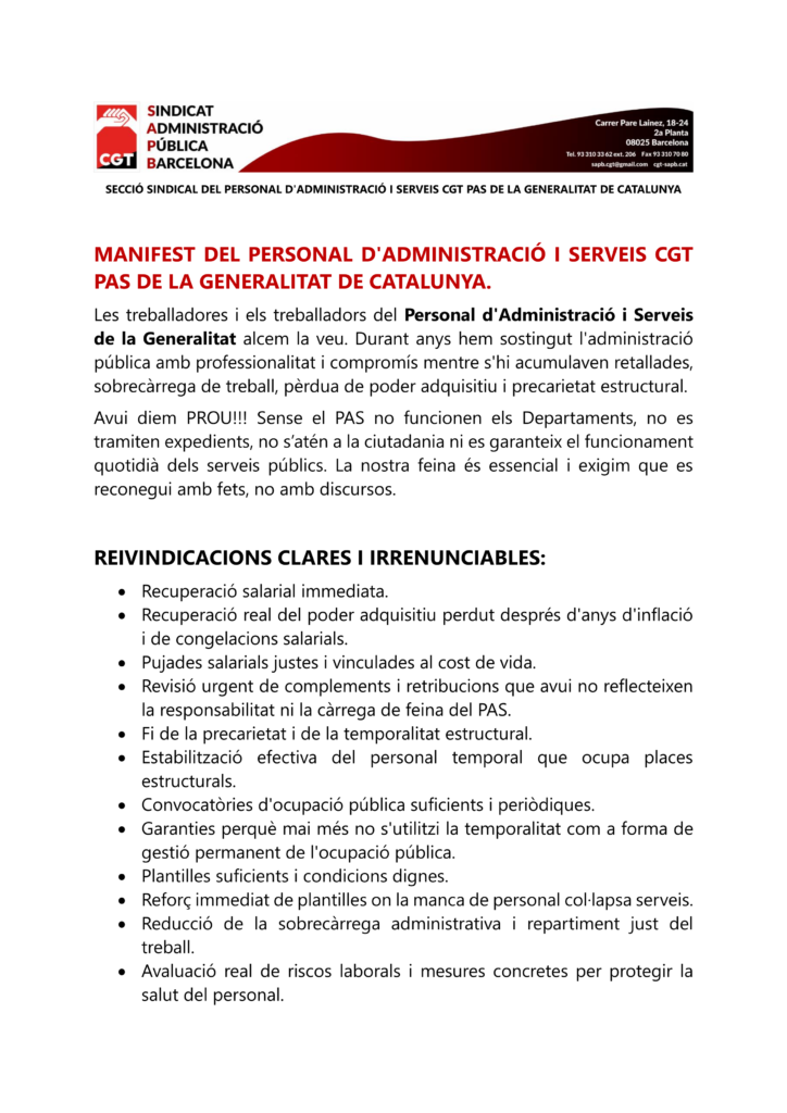 MANIFEST DEL PERSONAL D’ADMINISTRACIÓ I SERVEIS CGT PAS DE LA GENERALITAT DE CATALUNYA.