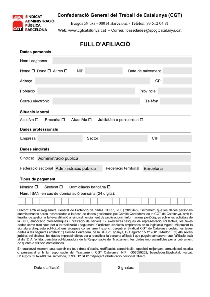 Afilia’t Full d’afiliació CGT Full d’afiliació en PDFBaixa Quota d’afiliació CGT Envia’ns el teu full d’afiliació omplert i signat a: sapb.cgt@gmail.com Tweet
